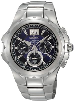 Seiko Coutura. This masculine Big Date Chronograph has a brushed and polished stainless steel case and bracelet. The polished bezel is accented with diamond cuts that perfectly catch the light. The blue dial has LumiBrite hands and markers and can measure up to 60 minutes in 1/5th second increments as well as split time measurement. Sapphire crystal is virtually scratch resistant and the cabochon crown adds that finishing touch. 100 meters water resistant. The perfect watch to accompany any attire.